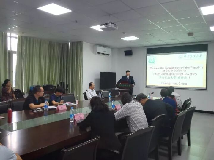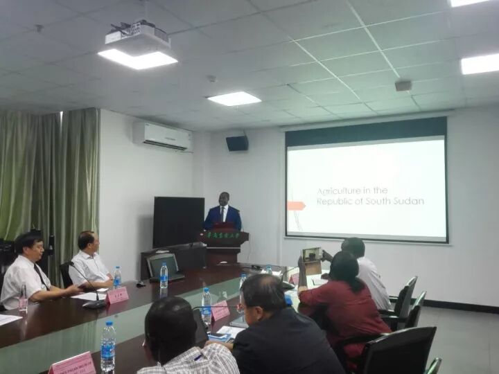 南苏丹农业部副部长约翰.奥古托.卡尼西欧做了《南苏丹的农业发展》的报告,主要向在场人员介绍了南苏丹国家的经济以及农业发展现状。他指出南苏丹的农业产业多随着地形而分布,虽然目前受到劳动生产力、自然因素、土地资源以及经济发展水平等因素的限制,但拥有巨大的发展潜力。最后他介绍了南苏丹的农业发展规划中两个重要计划:综合农业发展计划(CAMP)以及灌溉农业发展计划(IDMP),表示这是中苏两国农业共同的机遇。团队教师们与来宾们就南苏丹的农业作物种植、农用无人机应用条件基础、紧缺问题等展开了深入探讨。