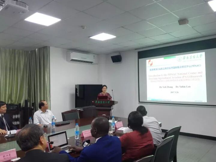 张亚莉副教授向来宾详细地介绍了中心的现有研究基础、研究方向、科研试验和未来发展目标等。本中心是2016年由科技部认定的国家级国际联合研究中心,中心自成立以来,在兰玉彬教授的带领下,一直努力强化我校在农业航空,尤其是农用无人机精准施药技术领域的引领作用,不断凝聚农业航空领域世界尖端人才和促进我校在相关领域的国际化水平。另外,精准农业航空团队近两年来已经联合国内植保企业,在全国十几个省份开展田间试验三十多次,对农业航空技术的研究、普及和推广都起到了良好的推动作用。