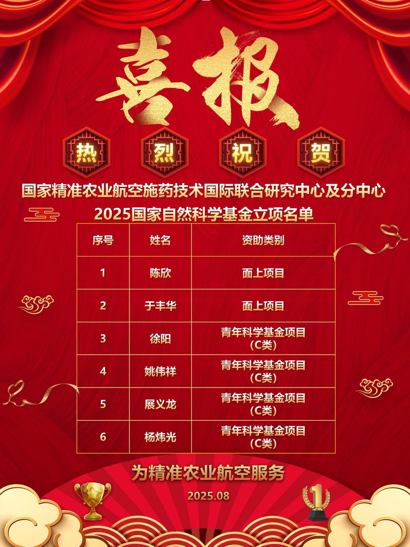 近日,国家自然科学基金委员会公布了2025年度国家自然科学基金的评审结果,国家精准农业航空施药技术国际联合研究中心及分中心6项课题获批。