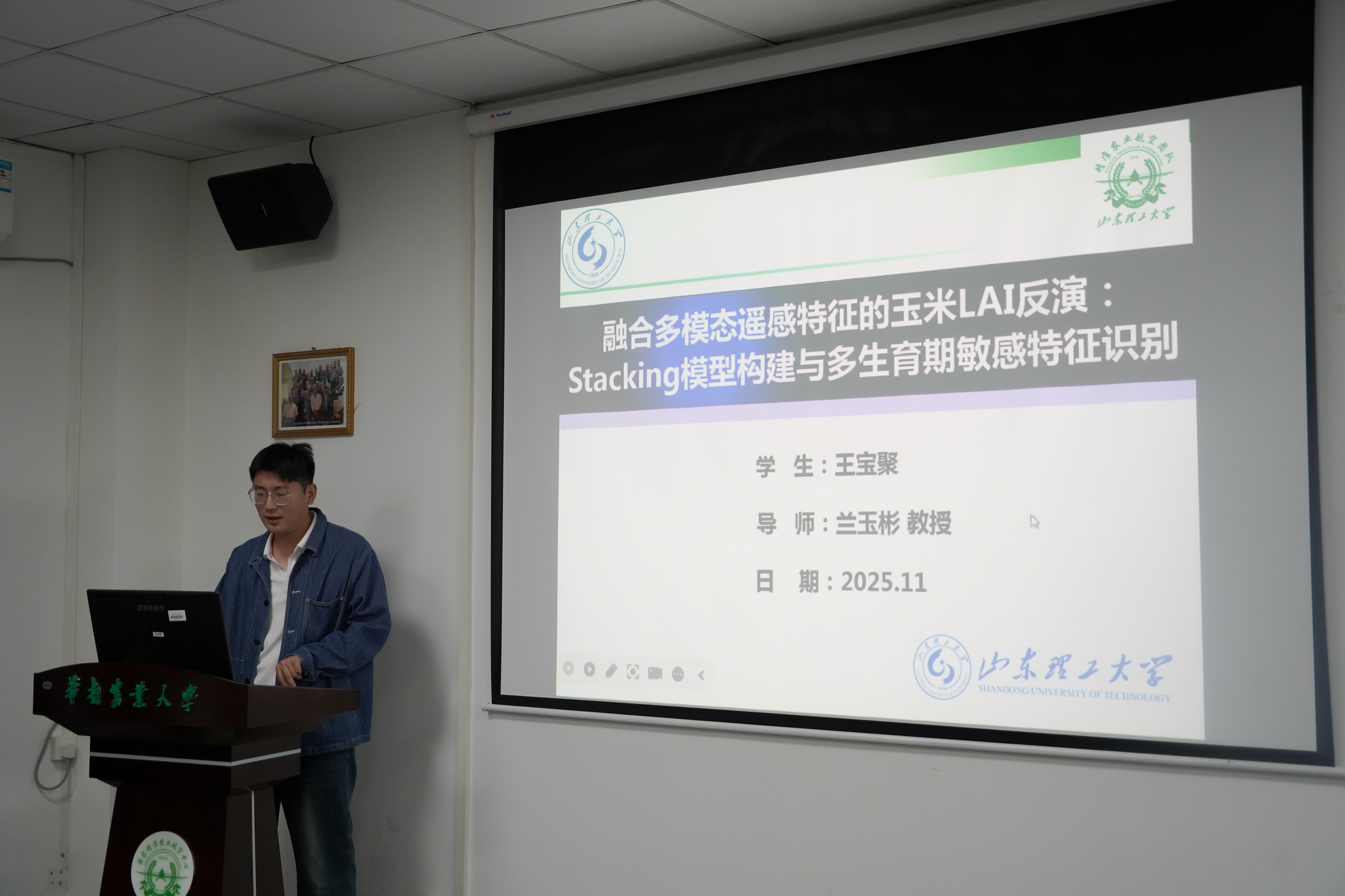 最后,山东理工大学博士研究生王宝聚作《融合多模态遥感特征的玉米LAI反演:Stacking模型构建与多生育期敏感特征识别》报告,重点讲解了Stacking模型在玉米叶面积指数(LAI)反演中的应用优势,以及不同生育期遥感敏感特征的筛选方法,为作物长势监测提供了高效技术方案。