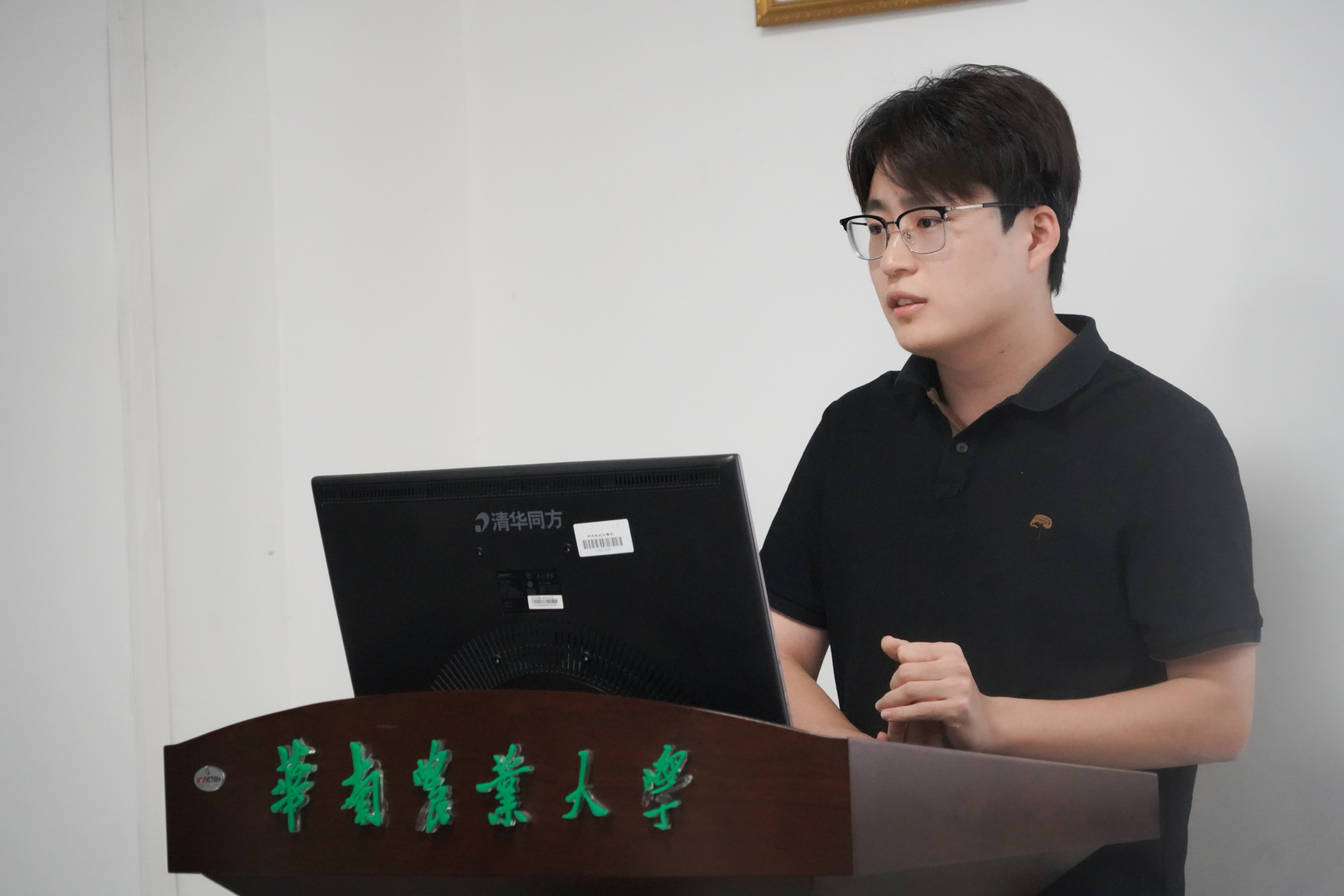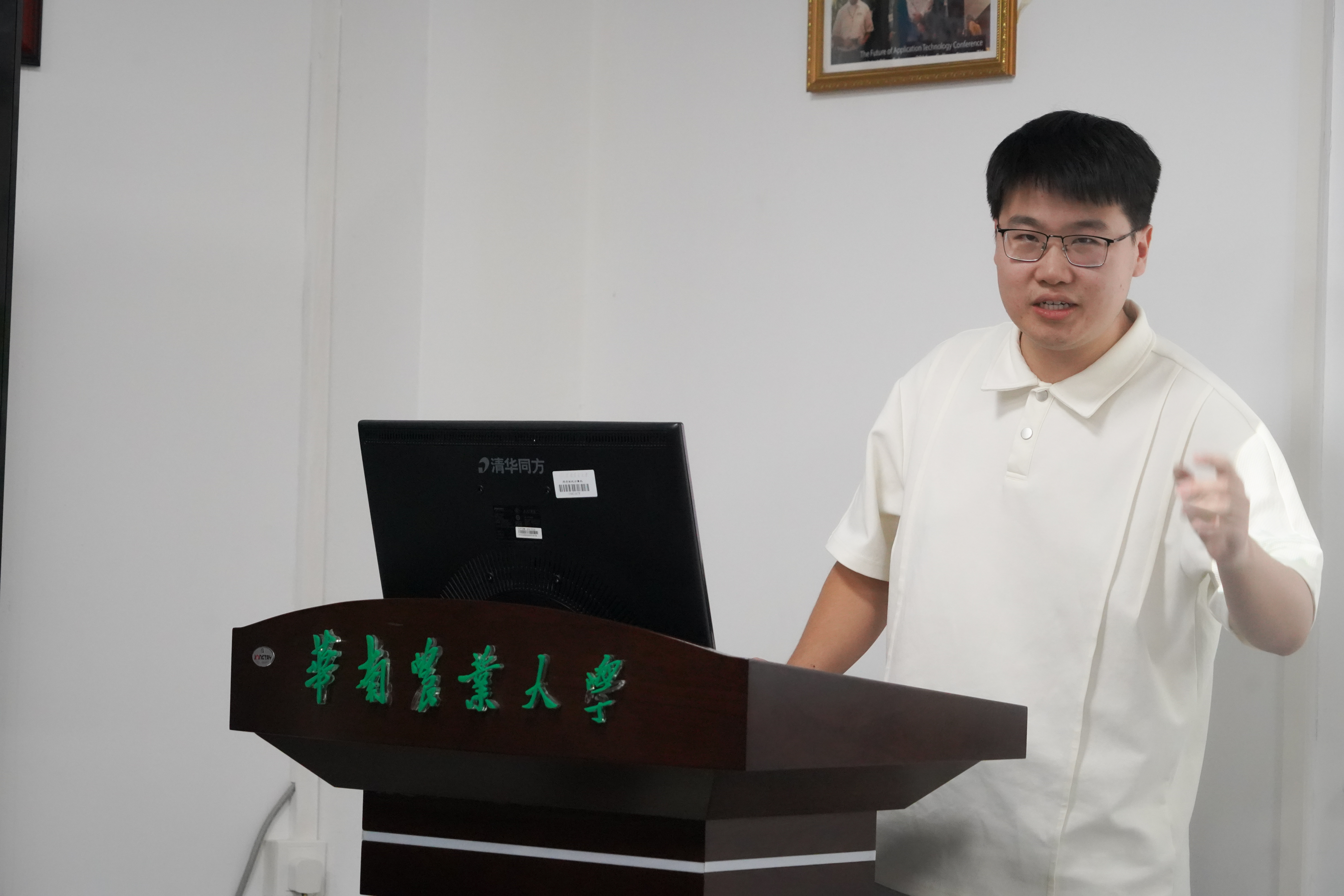 会议伊始,中心博士研究生秦英栋代表中心对山东理工大学三位同学的到来表示热烈欢迎。随后,他系统介绍了中心研究生团队的主要科研方向,涵盖精准施药技术、农业遥感数据分析、无人机装备智能化改造等核心领域,并分享了中心近年来在学术研究、成果转化等方面的进展,让到访学者对中心科研体系有了全面了解。